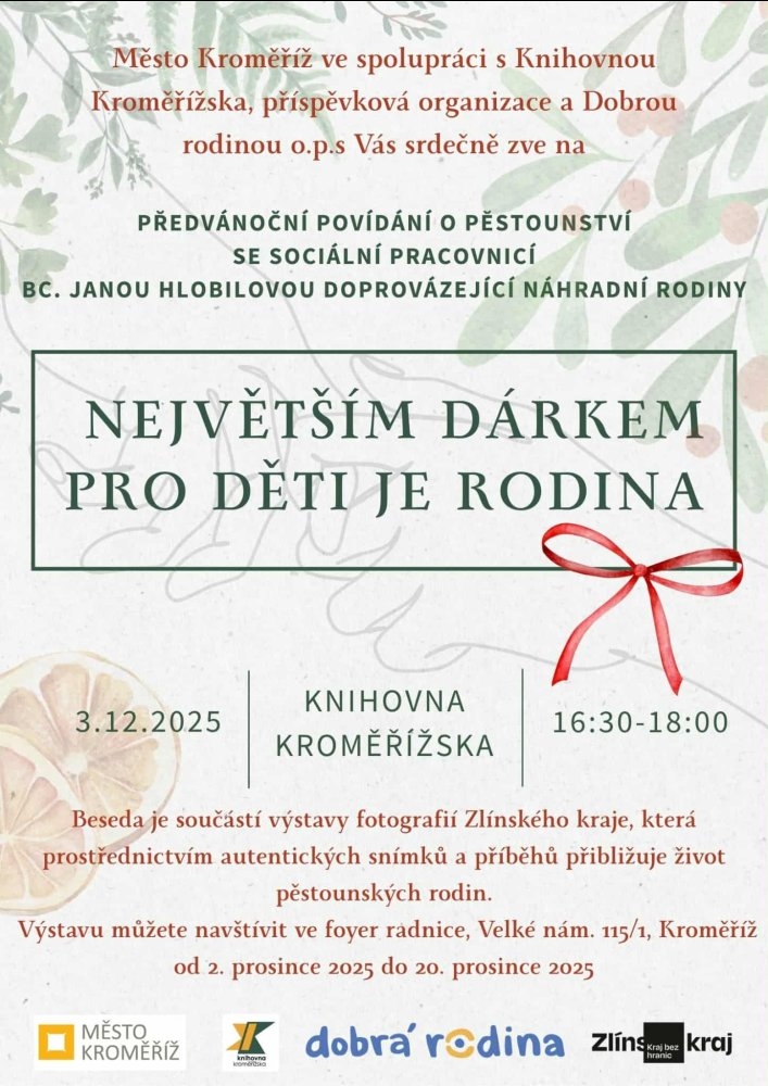 Pořádá Dobrá rodina o.p.s. ve spolupráci s Knihovnou Kroměřížska a městem Kroměříž. Beseda je součástí výstavy, která je přístupná ve foyer radnice od 2.-20.12.