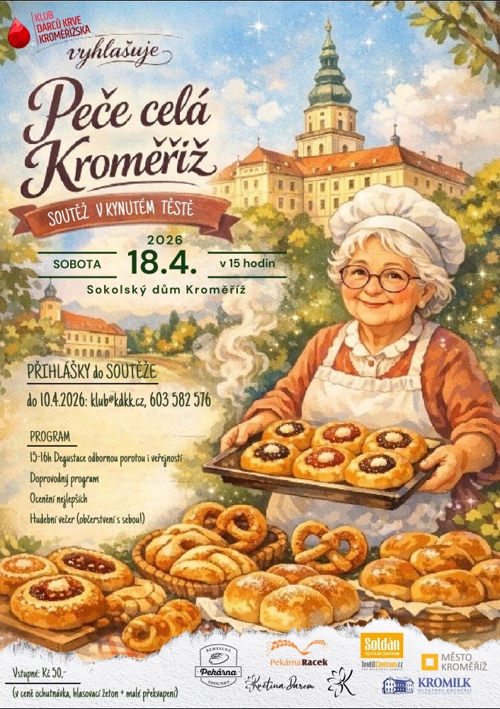 Peče celá Kroměříž aneb soutěž v kynutém těstě na slano i na sladko je připravena pro milovníky pečení. Tento první ročník je věnovaný kvasnicím neboli kynutému těstu a přihlášený soutěžící, který peče doma ve vlastní troubě si může vybrat ze dvou variant - na slano nebo na sladko, s náplní nebo bez a v určený čas přinese již hotový výrobek. Hodnotí a ceny uděluje odborná porota i veřejnost.