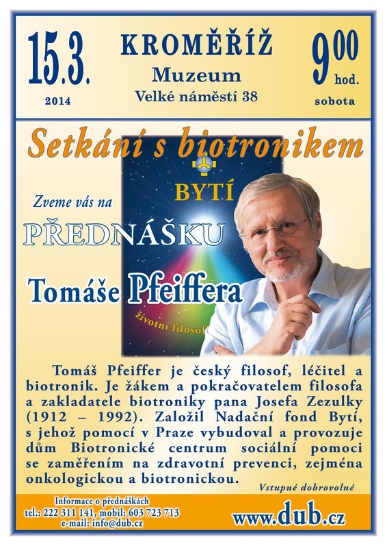 Témata přednášek určují návštěvníci sami, a to svými dotazy. Tyto se mohou týkat rozmanitých oblastí života, jako je biotronická prevence, filosofie a jiné. Okruh otázek je široký - Jsou to otázky osudu, smyslu života, nauka o vznikání, tedy celkově otázky filosofie Bytí, a to i s dopady do hmotných oborů. Vstupné je dobrovolné. Na závěr přednášek proběhne biotronické působení formou rozloučení. Více informací naleznete na www.dub.cz Zde je i možnost sledovat přednášky přes internetovou televizi. Přednáška se koná v sobotu15. 3. v 9 hodin v Muzeu Kroměřížska.