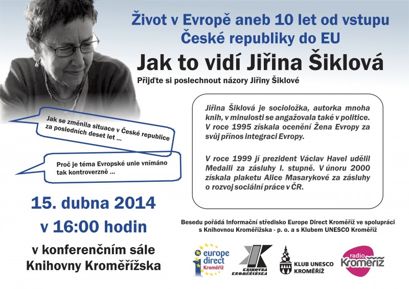Beseda s Jiřinou Šiklovou pod názvem "Život v Evropě aneb 10 let od vstupu České republiky do EU".Jiřina Šiklová je socioložka, autorka mnoha knih, v minulosti se angažovala také v politice. V roce 1995 získala ocenění Žena Evropy za svůj přínos integraci Evropy. Začátek v 16:00 hodin v konferenčním sále knihovny. Vstup zdarma.