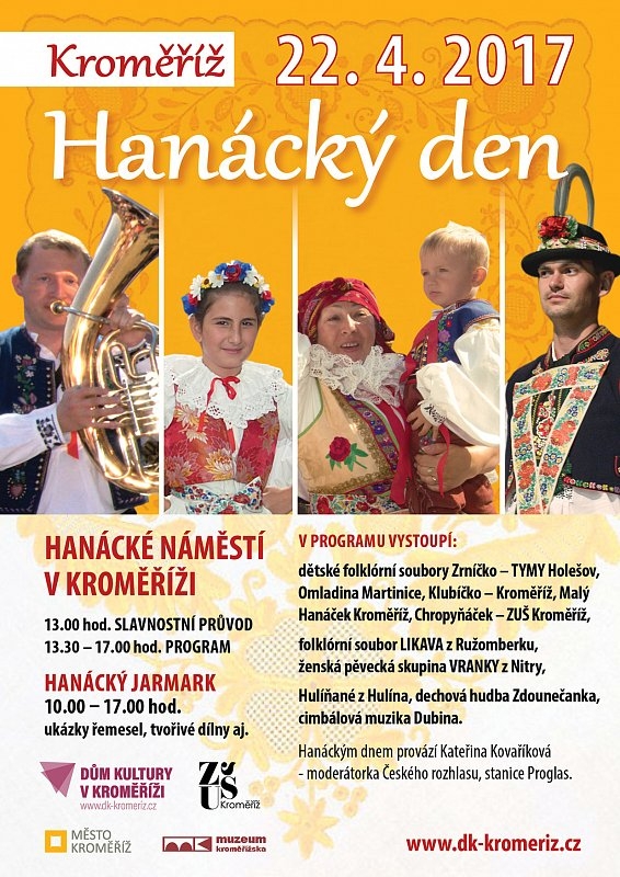Město Kroměříž ve spolupráci se ZUŠ Kroměříž a Domem kultury pořádá v sobotu 22. dubna na Hanáckém náměstí HANÁCKÝ DEN - zábavné odpoledne směřující k podpoře hanáckého folklóru ve městě i jeho okolí formou prezentací souborů, krojů, zvyků a obyčejů, tvůrčích dílen i regionální gastronomie. O úvod se postará v 13.00 Slavnostní průvod po kterém bude následovat bohatý kulturní program,. ve kterém vystoupí řada dětských folklórních souborů, Hulíňané z Hulína, dechová hudba Zdounečanka, cimbálová muzika Dubina, ženská pěšvecká skupina Vranky z Nitry či folklórní soubor Likava z Ružomberoku.
