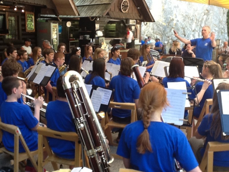 Dechová sekce Oxfordshire Schools Symphony Orchestra v čele s dirigentem Mikem Skittem.