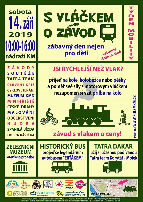 Evropský týden mobility se blíží i s vláčkem o závod Letošní Evropský týden mobility v Kroměříži opět nabídne možnost zazávodit si s vláčkem. Stejně jako v minulých letech, bude i letos v nákladním obvodu železniční stanice připravena lokomotiva “Prasátko”, aby si s ní mohli změřit síly odvážlivci všech věkových kategorií. Již potřetí se totiž na kroměřížském vlakovém nádraží uskuteční sportovně-kulturní akce S vláčkem o závod, kterou pořádají spolky Kroměřížská dráha a Kolem KM za podpory města Kroměříže a Českých drah. Kromě samotného závodu s lokomotivou bude připravena i řada dalších atrakcí: otevřené Železniční muzeum vedle budovy vlakového nádraží, program pravčických cykloveteránů PRAKR nebo různé dovednostní soutěže. A pozor, opět přijedou toulavý historický autobus Škoda, motoráček Hurvínek a slavný náklaďák Tatra.