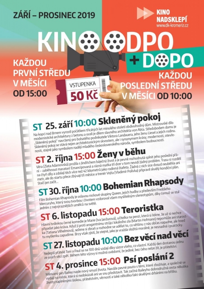 Kino Nadsklepí v nové sezoně pokračuje s projektem nazvaným "Kino odpo" a "Kino dopo". Jedná se o odpolední promítání vždy od 15:00 každou první středu v měsíci a dopolední promítání vždy od 10:00 každou poslední středu v měsíci vždy za zvýhodněné vstupné 50 Kč. Pro všechny seniory, maminky na mateřské, lidi se směnným provozem, studenty co jim odpadne odpolední vyučování...zkrátka a dobře pro všechny, co nemají večer čas, ale odpoledne či dopoledne by si do kina zašli.
