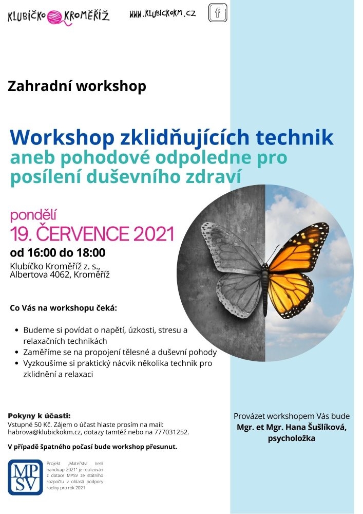 Srdečně Vás zveme na zahradní workshop s psycholožkou. Budeme si povídat o napětí, úzkosti, stresu a relaxačních technikách, zaměříme se na propojení tělesné a duševní pohody a vyzkoušíme si praktický nácvik několika technik pro zklidnění a relaxaci.