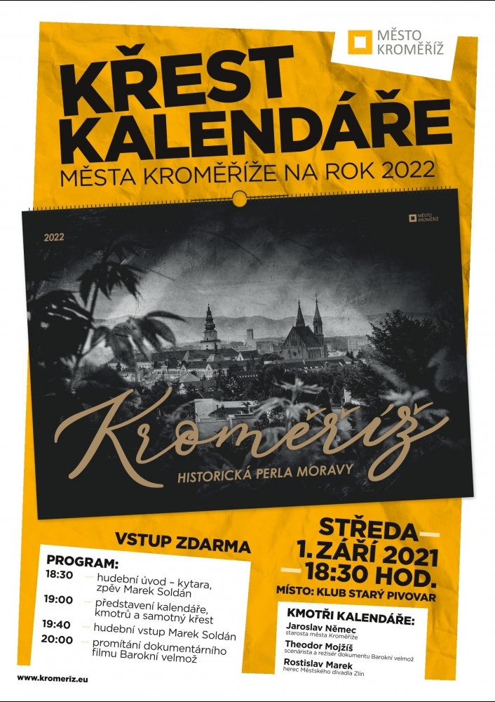 Křest kalendáře se uskuteční ve středu 1. září od 18.30 hodin v prostorách Klubu Starý pivovar. Úloh kmotrů se ujmou starosta města Jaroslav Němec, režisér, scénárista a producent Theodor Mojžíš a herec zlínského divadla a kroměřížský rodák Rostislav Marek, který bude zároveň průvodcem a moderátorem večera.Program:18,30 - hudební úvod – kytara, zpěv Marek Soldán19,00 - představení kalendáře, kmotrů a samotný křest19,40 - hudební vstup Marek Soldán20,00 - promítání dokumentárního filmu Barokní velmož