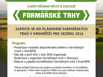 Přečíst celý článekV pátek 26. února 2016 od 15:30 proběhne v Kroměřížské knihovně veřejné diskuse o podobě kroměřížských farmářských trhů v sezóně 2016.